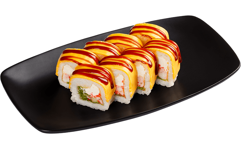 соєвий папір, рис, сир Філадельфія, креветка, огірок, тобіко, салат, соус унагі